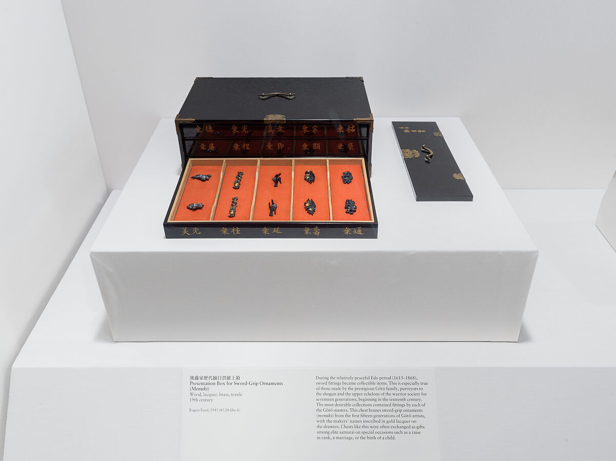 During the relatively peaceful Edo period (1615–1868), sword fittings became collectible items. This is especially true of those made by the prestigious Gōtō family, purveyors to the shogun and the upper echelons of the warrior society for seventeen generations, beginning in the sixteenth century. The most desirable collections contained fittings by each of the Gōtō masters. This chest houses sword-grip ornaments (menuki) from the first fifteen generations of Gōtō artists, with the makers’ names inscribed in gold lacquer on the drawers. Chests like this were often exchanged as gifts among elite samurai on special occasions such as a raise in rank, a marriage, or the birth of a child.