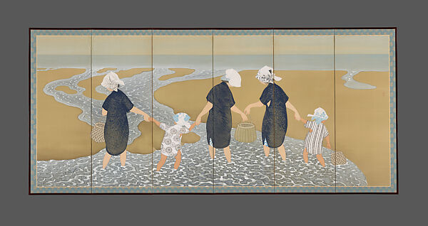 A group of five women and seven children gather shellfish along the seashore after the high tide, of a summer month, has receded. Against a glistening silk background (painted gold with an admixture of silver), the women wear deep azurite blue robes while donning kerchiefs with light blue patterns. Each of the children wears a robe with motifs borrowed from Rinpa pattern books, all rendered in mottled gold and ink. The diverse array of textile patterns may reflect the fact that the first owner of this deluxe set of screens was Fujii Zenshichi, the founding director of Maruike Fujii, the foremost textile wholesaler of the day in Kyoto.