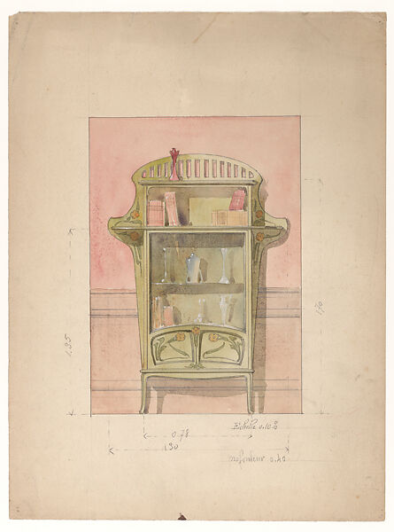 Design for a display cabinet in the Art Nouveau style. The cabinet is painted green with orange flower motifs. The cabinet consists of an open shelf at top that is used to store books. Below it, two further shelves appear to be covered by a glazed door. The piece is presented in elevation, but placed against a wall with red wallpaper and wainscoting in plain wood. Annotations with measurements are added at left, right and below the drawing. The drawing is part of a group of designs for furniture in the French Art Nouveau style by two prominent designers of the late 19th and early 20th century: Edward Colonna and Georges de Feure. The designs are executed in graphite and finished with watercolor. The furniture designs are represented in an interior setting or drawn against a blank background. All furniture pieces are meant to be made out of wood and range from small tables, cabinets and display cases, to buffets and servers, a wardrobe, a vanity table, a bench and a chair. The high degree of finish of the drawings suggest that they were used for presentation to clients, or possibly served as the model for lithographic illustrations. The Museum has several furniture pieces by both artists that closely relate to the present group of drawings, the design for a small side table by Colonna, in particular, show great similarities.