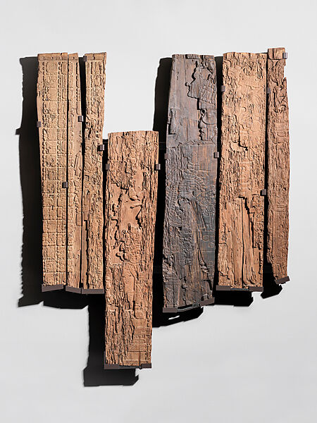 This work of art is currently on loan to the museum.A scant few works carved in wood in antiquity survive to the present day. This remarkable lintel—the horizontal support that once spanned the doorway into the inner sanctum of a massive temple—presents a celebration in the wake of Tikal’s victory over rival Naranjo. Tikal’s king, Yihk’in Chan K’awiil, appears in profile at center carried on a palanquin seized from his rival, bearing a round shield and holding a scepter with the figure of K’awiil, the lightning god and a symbol of rulership. The king is dwarfed, however, by the god looming behind him: this being, face shown in profile, has the markings of a jaguar deity, including a feline ear and spots on the thigh. A beaklike projection in front of his nose identifies him as Hummingbird Jaguar. One of Naranjo’s patron deities, he has been taken captive and is being paraded through Tikal.