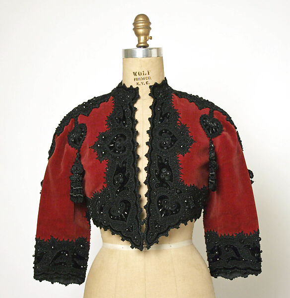 Accomplished tailoring was one of the traits of Balenciaga, but he also maintained an interest in Spain, rustic traditions, and the costumes of the toreador. In the fierce nationalism of reopening his salon after World War II, he returned to Spanish themes, including this highly ornamented bolero redolent with the bullfight.