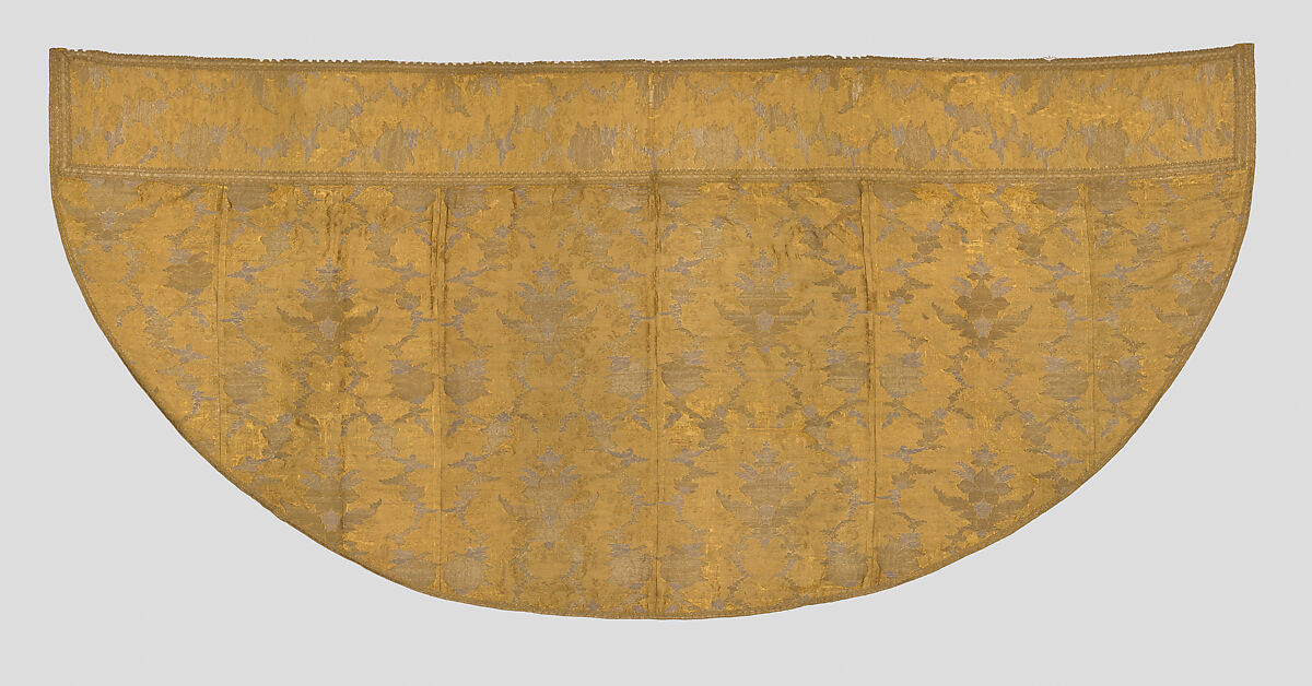 This splendid, semi-circular garment was intended to be worn, cloak-like, by the priest performing Catholic rites during church services. Glimpsed at the candle-lit altar as he prepared the tools of mass, the priest would have sparkled and shimmered, enveloped in exceedingly fine brocaded silk, with the repeat of its bold floral figurative design achieved by the complex interweaving of dyed yellow silk and precious silver-wrapped metal-threads, against a continuous ground of finer, silvered wire.