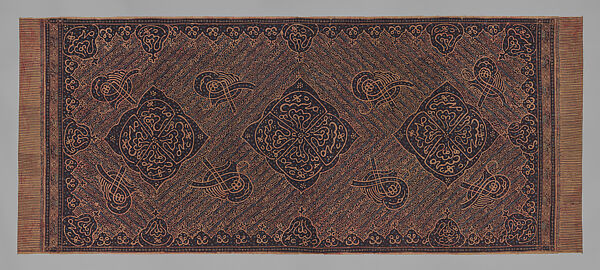 This large rectangular batik from Indonesia is among the rarer examples in purple color. Although made in a typical Southeast Asian textile technique, its design evokes arts of the Ottomans. The overall composition compares with carpets with a center field consisting of three larger lozenge medallions, a border, and on the shorter side a sequence of lines reminding of a carpet’s fringes. The calligraphic composition with repetition of Allah, Muhammad, and perhaps the Basmalla formula, as well as a stylized version of an Ottoman Tughra motif provide this beautiful textile with strong apotropaic powers. Although in an Ottoman context the Tughra represents the symbol of the sultan, ruling authority and power, in Southeast Asia such calligrams functioned as talismans often appearing in devotional and ritual contexts, placed for example in mosques a top of mihrab prayer niches. The prominent use of the Tughra together with the inscriptions of Allah and Muhammad, suggests that the batik was likely used in a ceremonial or devotional context. Perhaps worn wrapped around the head similar to a ceremonial headdress or used in another ritual context.