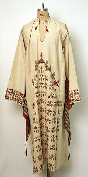 This white dress or thob belongs to a group of festive garments from Syria. A widening skirt with rich embroidery and long colorful triangular (winged) sleeves with tassels hanging down at the edges enhance the wearer’s movements during dance. Such dresses are associated with festivals and weddings and the weaving traditions of Qalamoun, a mountainous region in northwest Syria near the Lebanese border. Such dresses from Qalamoun were worn over a pair of decorated trousers.