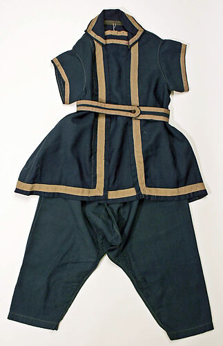 The 1860s and 1870s saw the revival of a number of historical periods in dress. Classical references were apparent in the appearance of laurel swags, wave meanders, and Greek-key bands on such categories of apparel as children's dresses, men's smoking ensembles, and dressing gowns, and on all forms of womenswear and accessories. In the bathing costume shown here, the connection to the natural and healthful life of "sport" associated with the ancient Greeks is especially apt. Of course, the wool cloth, heavy and hardly buoyant when wet, was not appropriate for vigorous water sports. Rather it was meant for what was considered the more feminine activity of "bathing," a simple immersion that allowed for some bobbing or a few strokes without any real possibility of sustained swimming.
