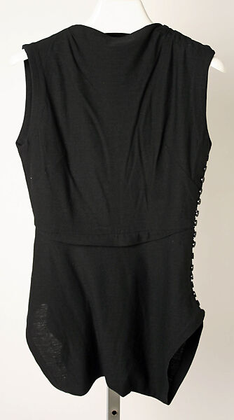 McCardell understood the skivvies connection: underwear and swimwear. Using fastenings and jersey material appropriated from underwear, she made her version of the little black dress as a beach outfit. More often, McCardell bathing suites are of cotton stripes and plaids.