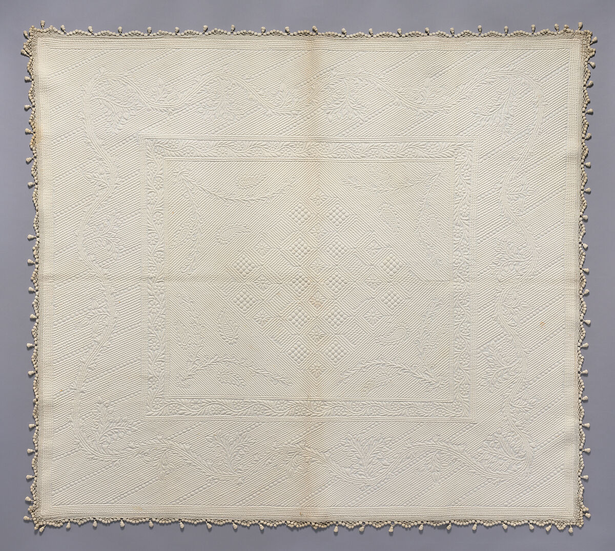 The initial impression of simplicity conveyed by this elegant, monochromatic coverlet, probably made for a bed or table, belies the intense skill and virtuoso technique demanded of its creator. Historically described as “whitework,” this is a whole-cloth quilt (as opposed to a pieced or “patchwork” quilt). It is distinguished by a total absence of colored pigment: instead, the decorative and figurative design is achieved on a bleached white support via quilted stitching, with additional relief created by highlighting and shadowing by inserting cords and pellets of stuffing between layers of support. Requiring considerably more skill and dexterity to stitch than pieced quilts, works like this were conventionally regarded in Europe as more subtle and tasteful than patchwork pieces. Distinguished by its crisp and legible design of floral posies set within a diaper-patterned ground, this is representative of the types of motifs popular on the Italian and Iberian peninsulas and in southern France, where this technique is traditionally believed to have originated. The stitching is so fine that at first glance this might be confused with nineteenth-century machine-loomed imitations of stuffed and corded work–so called “Marseilles quilts”–if it were not for the tiny hand-stitching articulating the design detectable on its reverse.