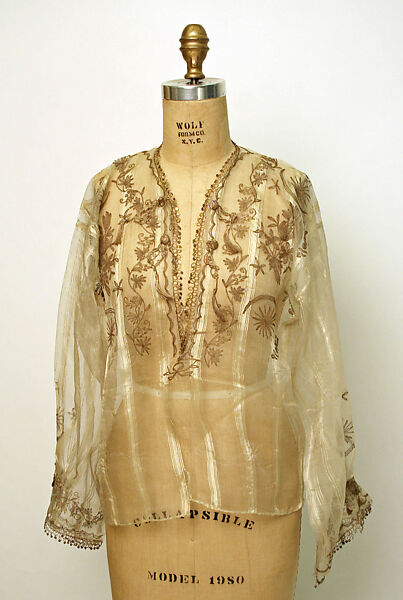 Made of an extremely sheer organdy with stripes woven into the fabric, this blouse was produced for sale to foreign visitors. The loosely fitted undershirt typically worn by Ottoman women has been adjusted for European taste to be a more formfitting blouse, similar to those worn in Orientalist photographs of harem women. The hip-length garment has a center front opening and long full sleeves. The sleeves, neck opening and bodice area are decorated with chain stitch embroidery in a dark tan color, perhaps carried out by machine. Embroidery motifs include floral garlands, bouquets, and a star and crescent. A looped thread trim with gold-colored metal sequins finishes the neck opening and sleeve edges. Tassels on the bodice complete the garment’s decoration.