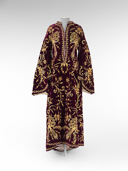 Made of wine-colored silk velvet, this bindalli (bindallı in Turkish) dress differs from others in the collection in a number of ways, but still displays two of the key elements of this kind of dress: the velvet fabric and the extensive gold dival embroidery employing floral designs. The structure of the dress, with a very long front opening, small stand up collar and bell-shaped sleeves may indicate an origin in the Balkans (the dress was originally purchased from a family in Albania). Darts or pleats at the waist create a much more fitted silhouette for the garment than is typically the case. The large bows which gather together the floral sprays on the bodice and sleeves are quite unusual, although the flowers themselves resemble those found on other bindalli dresses. The bindalli dress was worn by both Muslim and Jewish women of different economic classes in the Balkans and Anatolia for weddings and other special occasions, beginning in the second half of the nineteenth century. As this example shows, regional variations for the dress emerged in response to local taste and fashion traditions.