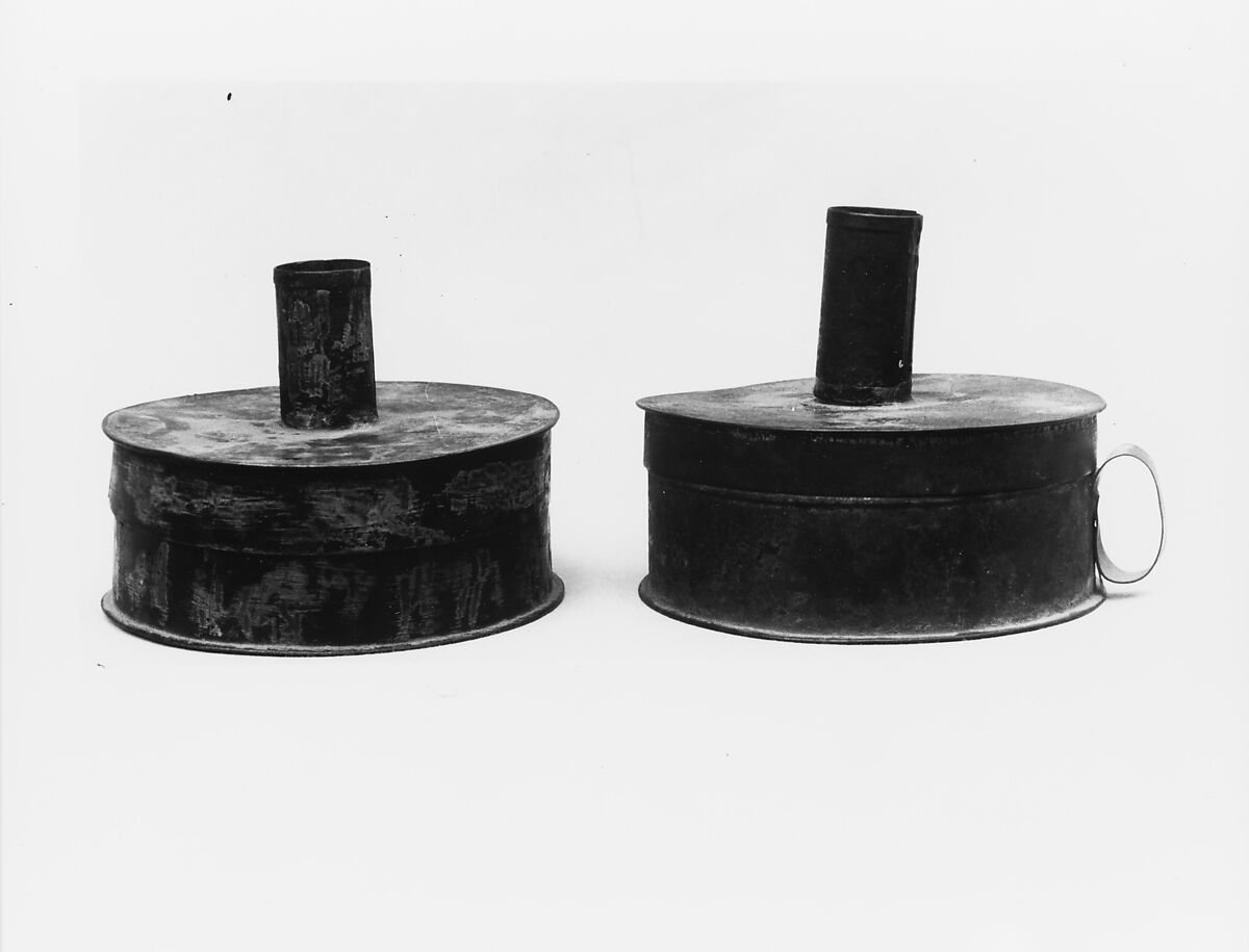This tinderbox has a candle socket in the center of the cover. A disc for covering the tinder is inside the box.