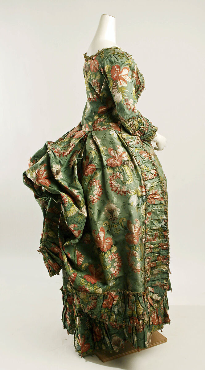 The term robe à la polonaise is often applied to any late-eighteenth-century dress with back drapery, but it should be reserved for a dress with a fitted anglaise back and a skirt that can be drawn up on interior tapes into swags. These light, informal dresses enjoyed great popularity for daywear in the late 1770s and 1780s. "Polish" fashion had appeared earlier in honor of Queen Maria Leczinska, who was a Polish princess before she married Louis XV. The "Polish" styles consisted mainly of gowns trimmed with fur or a brocaded fur pattern. Camisoles, caracos, bonnets, and even men’s frock coats were also called à la polonaise at the height of the fashion in 1780.