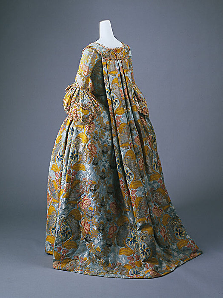 This formal dress is believed to have belonged to a young girl. Until the last quarter of the eighteenth century, children were dressed as miniature adults, with girls being put into corseted bodices from about three years of age, graduating to adult dress when they reached twelve or thirteen. This gown is made from an extremely costly silk, woven with (69.79.3), and would have been worn for a formal occasion.