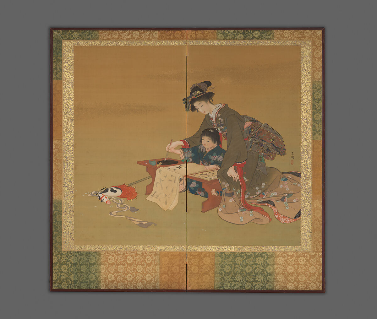In this meticulously and sensitively painted screen, a young boy, who has set his hobbyhorse aside, is being initiated into the practice of traditional Japanese calligraphy by his older sister. Kneeling at a low desk with traditional writing implements (a brush, inkstone, and inkstick), he focuses as his sister guides his hand. The first page of practice, seen from reverse, includes the first four kana of the iroha—いろはに iro ha ni (the colors [of flowers are brilliant]—an ancient poem cleverly incorporating all forty-seven syllables of the Japanese syllabary, but each just once. The young boy then was clearly nudged to repeat the first two characters, iro いろ, and then again on the new page. The open book beside his work sheet provides model writing for him to follow. Traditionally, copying and mastering the iroha was the first step in practicing calligraphy for a young person.