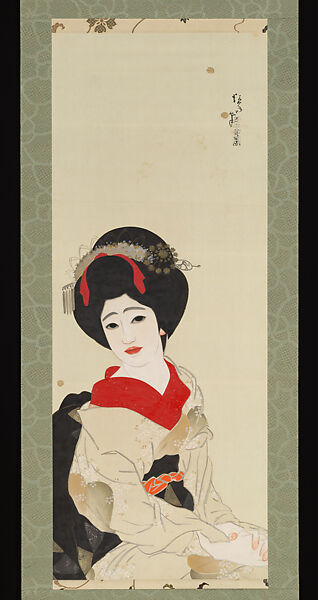 The artist himself—in his inscription cursively brushed on the box lid—gave this work the title of Maiko 舞妓, literally, “female performer of dance,” but which refers more broadly to young female entertainers, usually age 17 to 20, in Kyoto and Western Japan, who are training to be professional geisha. Tsunetomi is known to have been a habitue of the pleasure quarters of Kyoto and Osaka, and painted numerous portrayals of women entertainers throughout his caree. Maiko and geisha were popular subjects of modern bijinga (paintings of beautiful women) of the early twentieth century. Here the maiko is captured in a seated, relaxed pose and calls to mind his celebrated painting After a Bath (Yokugo) of 1912, just a few years before this work, which shows a young woman kneeling on a veranda.