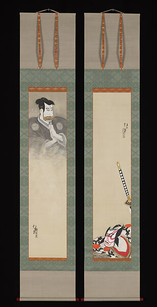 This eye-catching pair of paintings of Kabuki actors is a most unusual work by Kitano Tsunetomi, who earned lasting renown for his meticulous depictions of modern Japanese women. It seems that that Tsunetomi did not base his depiction of these actors on a performance he had actually seen; rather, he created an imaginary pairing of two famous actors known for occasionally performing roles in a popular play titled The Disputed Succession of the Date Clan (Meiboku Sendai Hagi). That play was inspired by actual events of seventeenth-century political strife within the Date clan of Sendai. The two staring roles of the play are Arajishi Otokonosuke, represented here by Ichikawa Danjūrō on the right, and the arch villain of the story, Nikki Danjō, played by Matsumoto Kōshirō—as identified by the artist himself on the inscriptions brushed in his distinctive hand on the storage box for the work. The portrait on the left does in fact resemble Matsumoto Kōshirō VII (1870–1949, who held this stage name from November 1911 until his death. What most likely prompted Tsunetomi to create this work was the commemoration by Kabuki fans, in 1917, of the fifteenth anniversary of the death of Ichikawa Danjūrō (1838–1903), one of the most successful Kabuki actors of the Meiji period. The ninth actor to hold this prestigious hereditary name, Danjūrō was credited with helping invigorate and perpetuate the traditional form of theater during an age of modernization. The artist Tsunetomi was known to be a Kabuki fan himself, but no doubt he was commissioned by a patron of the theater to create an imaginary scene from a memorable play depicting two of the most famous actors who performed in these roles.
