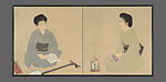 Two elderly geisha, serenely posed and elegantly attired are enjoying a quiet moment, perhaps before they have to entertain guests later in the evening. On the right, the woman holds a long-stemmed kiseru pipe while she takes a pinch of tobacco from a small purple silk purse lined in a soft blue; in front of her the simple wooden tray holds a small ceramic brazier with charcoal already glowing, and beside it is a matching receptacle for the ashes. Her companion on the left peruses a book of libretti for Jōruri puppet plays, perhaps reviewing what songs she will recite to clients later to the accompaniment of the shamisen in front of her; the red brocade purse likely also holds the bachi (plectrum) for her instrument.