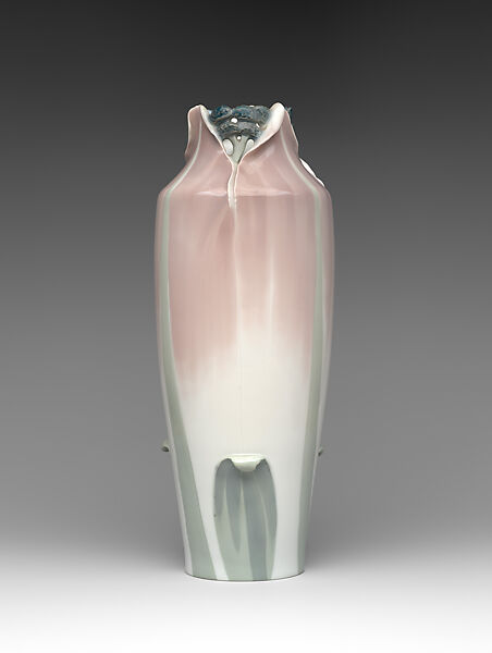Embodying Art Nouveau’s fascination with natural forms, designer Karl Lindström elegantly integrates the figure of a budding flower bud into this vase, blurring the boundary between decoration and structure. In the typical style of the Rörstrand factory at this time, the porcelain is delicately modeled in stylized relief and gently painted with a subtle palette of greens and pinks.