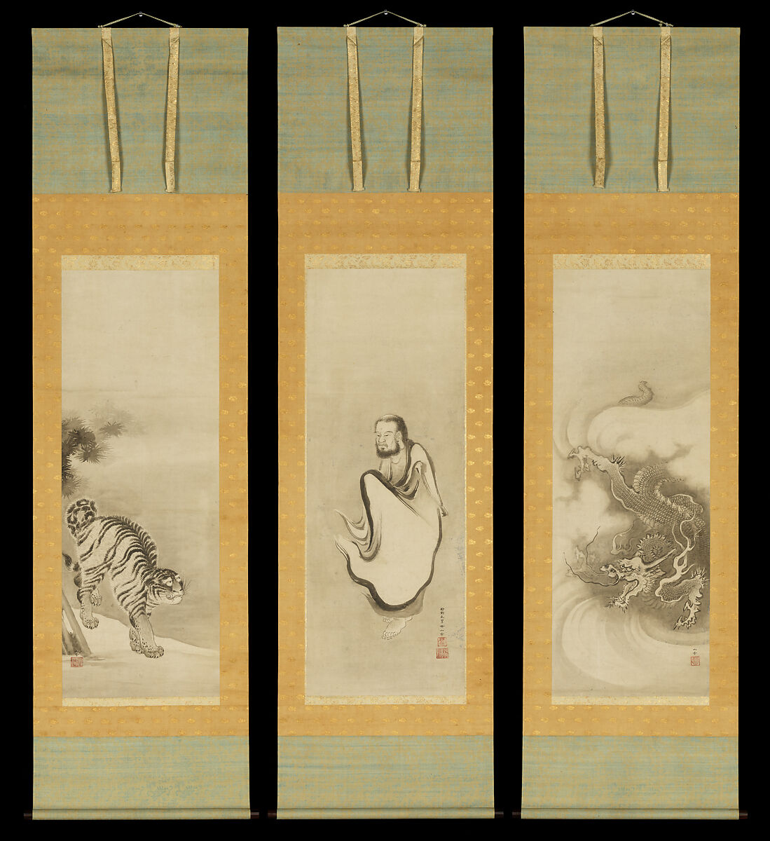 This triptych of scrolls centers on a pivotal moment in the historical Buddha’s personal spiritual development, as he emerges from the wilderness after an extended period of ascetic practice. Emaciated, with an unkempt beard, he is supported by two powerful beasts of heaven and earth commonly seen in Zen Buddhist pictures and spaces. At right a dragon bursts forth from a swirl of murky clouds, while at left a tiger tiptoes out of the shadows of a grove. Kano Sansetsu, a leading painter in Kyoto in the 1630s and 1640s and a central figure in Japan’s most prominent painting school, was devoted to the study of classical Chinese and Japanese pictures. While he was not a monk, his art draws on older Chinese and Japanese Zen images that were familiar to his sophisticated Kyoto audience of Zen priests and their wealthy patrons.