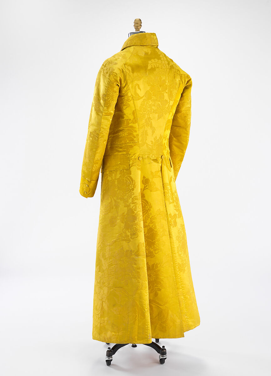 For at-home wear, a gentleman had a dressing gown, often with a matching waistcoat, and an undress cap or turban. As for breeches, they were not designed especially for this casual ensemble, but rather borrowed from other suits. The dressing gown was cut like a man’s loose coat and usually hung to the floor, though there were also versions that stopped below the knees. Since there were no fastenings, the wearer overlapped the dressing gown in front when he walked so that the sides did not billow out behind him. The sleeves were originally rolled back to form cuffs, but later dressing gowns display the fashionable cuff of their period. In England these dressing gowns were called "banyans" or "Indian nightgowns" because of their kimono-like form and Eastern origin. Banyans were made in a variety of fabrics, including silk brocades, damasks, and printed cottons. Winter banyans were occasionally quilted for extra warmth. Gentlemen received friends while attired in banyans as a sign of their informality and of their intimacy with the visitor. By the 1780s gentlemen ventured out of doors in this comfortable and stylish costume. According to Town and Country Magazine in 1785: "Banyans are worn in every part of the town from Wapping to Westminster, and if a sword is occasionally put on it sticks out of the middle of the slit behind. This however is the fashion, the ton, and what can a man do? He must wear a banyan." This yellow damask banyan with its bold Chinese Chippendale – inspired pattern would have been an imposing sight on the streets or in the drawing rooms of London.