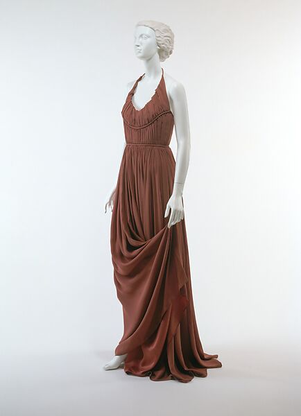 By the twentieth century, the pleating and the girdled midriff of this halter gown were well-established references to classicism. But in this dress, Edward Molyneux introduced a subtle new detail to frozen wet-drapery by replicating the fluted neckline seen on many Greek and Roman statues. As in Hellenistic sculptures, Molyneux fanned open the pleats of his gown's deep décolleté neckline. But like most pleated gowns of the post-World War II era, these folds are carefully controlled and secured by loose stitches to a structured, though in this instance flexible, underbodice. The modernist movement's affinity with classicism is evidenced in fashion from the beginning of the twentieth century onward. Here, the designer manipulated an experimental fabric into forms evocative of the antique. However specifically situated classical dress was to its own time, references to Hellenic styles have been freed from fashion's chronology by a sense of the timelessness of the ideals of beauty they evoke. In choosing to cite the past while also experimenting with a fabric of the future, Molyneux aligned himself with designers for theater and film, who costume imagined utopias past and future with the draped styles of the ancients.