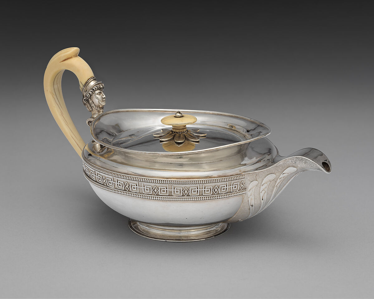 The service itself was made between 1804 (tea urn, milk jug and sugar bowl) and 1805 (teapot and coffeepot on stand) by the partnership of Digby Scott and Benjamin Smith II, active together between 1802 and 1807. The most imposing element of the service is a large and heavy tea urn, which is closely associated with a design in the collection of the Victoria & Albert Museum by Jean-Jacques Boileau, who was one of several Frenchmen who came to London in the aftermath of the Peace of Amiens of 1802 to be employed by the Francophile future Prince Regent for the decoration of Carlton House. At least seven urns of the same design can be traced, all of which are associated with the collections of high-ranking court officials or significant arbiters of taste, such as Thomas Hope, a vanguard of Britain’s aesthetic engagement with Ancient Egypt. The Met’s version appears to be the earliest example.