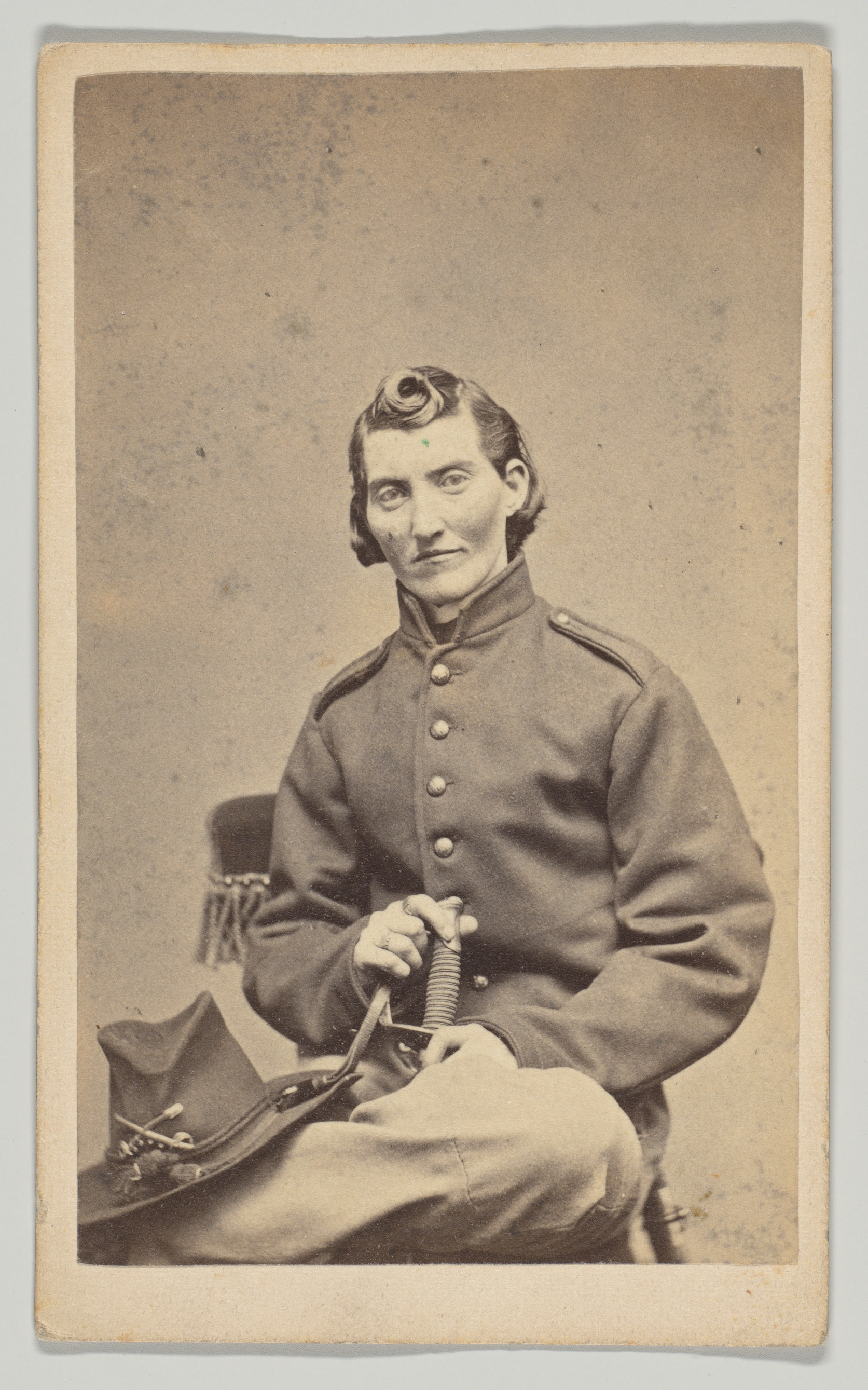The role of the camera during the American Civil War endures as one of the most studied and exciting subjects in American cultural history. This pair of carte-de-visite format portraits of the same individual, one presenting herself as a woman, the other as a man, illustrates the point. Frances Clalin Clayton, a woman, served in the Union army as a soldier by disguising herself as a man. In these cartes de visite, an affordable type of photograph collected by soldiers and civilians during and immediately after the the war's end, Clayton poses as herself and also as "Jack Williams." As a soldier, she suggestively holds the handle of a cavalry sword between her crossed legs. The facts of Clayton's life story and military service are difficult to confirm, but it is believed that she served in the Missouri cavalry (or infantry) beside her husband, who died at the Battle of Stones River in late December 1862.
