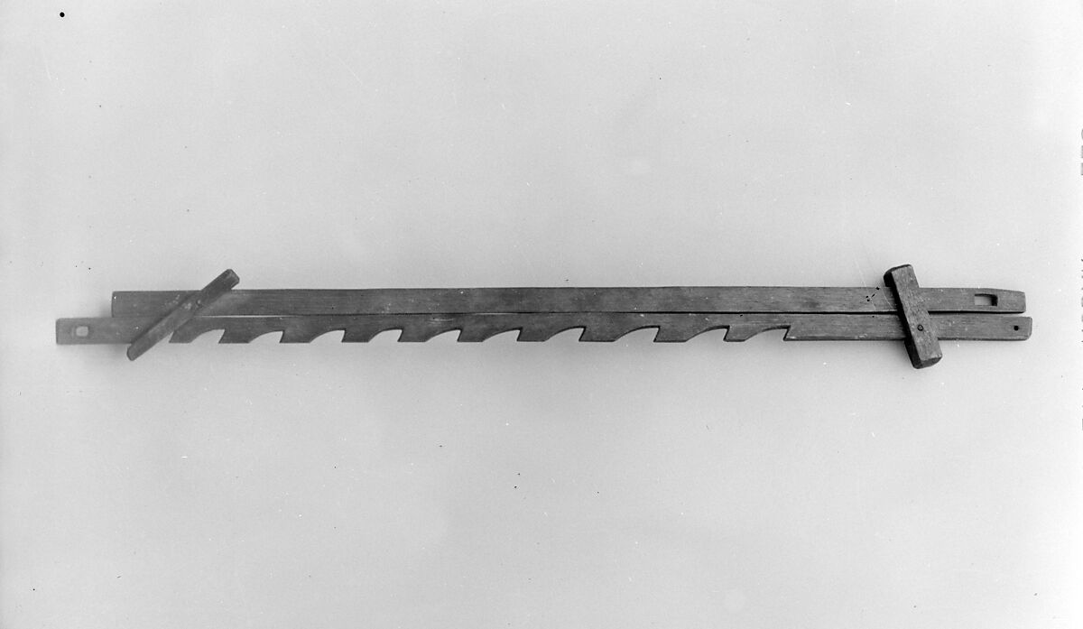 This trammel, since it is made of wood, probably functioned with a lamp as a means of adjusting its height.