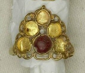 This delicate gold ring with inlaid turquoise and glass once belonged to a wealthy woman of the Ottoman upper classes. Only a few of the five incrusted pieces remain. It was common in Ottoman bridal jewelry to integrate red and turquoise colors in the form of semi-precious stones or glass. These colors were thought to have protective value, while red is also associated with blood. These two colors were particularly favored in bridal jewelry as a way of ensuring a healthy life and life cycle of the bride and protecting her during childbirth.