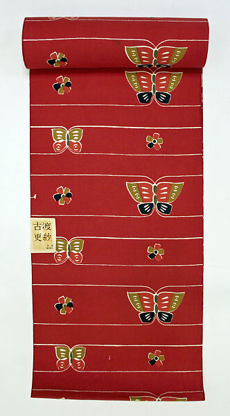 This modern-looking obi (sash for a kimono) was inspired by ancient sarasa (chintz), the pattern-dyed, vivid cotton fabrics that originated in India and became popular in Japan beginning in the late sixteenth century, when European ships began to transport them to nearby Asian countries as well as to Europe. Even in the twentieth century, the designs of these colorful fabrics are still being used and refreshed