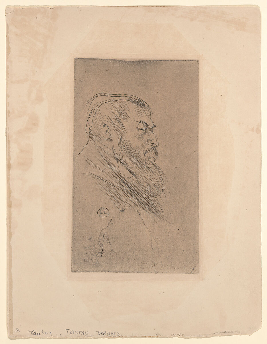Toulouse-Lautrec experimented with the medium of drypoint for the first time in 1898. He made nine portraits of friends using a steel needle on zinc plates. Still early in his career as a writer, Tristan Bernard, the subject of this print, managed two vélodromes, venues frequented by Lautrec in the 1890s. This plate remained in Bernard's possession and in 1920 he offered it to Löys Delteil to publish in his catalogue of Lautrec's prints. It was also included in a deluxe edition of Théodore Duret's book "Lautrec" published by Bernheim-Jeune that same year.