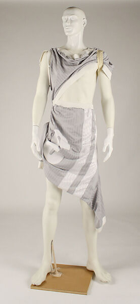 For his spring/summer 2001 collection, John Galliano produced a range of scanty chitons made from deconstructed football jerseys. The juxtaposition of a bared chest with classical drapery is an image of male authority that has resonated through history. Drawing on this image, Galliano's "locker-room" chitons combine two ideals of masculinity - the Greek god and the American football hero.