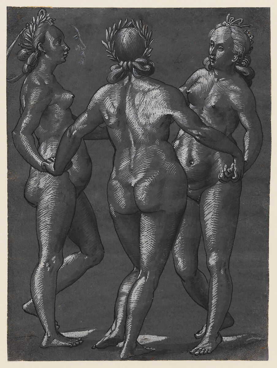 Treating the classical subject of the Three Graces, this work exhibits a spectacular handling of dark gray wash and white gouache to model the female body; against the mid-tone of the prepared paper, the parallel striations and cross-hatching of opaque white yield a remarkable sense of plasticity and volumetric form. The same technique and qualities are found in several other works by Murer: Mercury Waking the Arts from War-Induced Sleep, dated 1583 (Graphische Sammlung, Zurich); Head Studies (Kupferstichkabinett, Berlin); Allegory of Charity (Kupferstichkabinett Basel); and Dancing Couple (private collection). (This last sheet, which relates to Murer’s series of woodcuts known as The Ball, shares with the present drawing the same provenances from no later than 1918 until at least 1976.) This group of drawings bears the impact of the artist’s direct exposure to the work of Tobias Stimmer (1539-1584), in whose Strasbourg workshop Murer spent a couple of years, from roughly 1583 to Stimmer's death in 1584. The young artist may have been inspired, in part, by his master’s own depiction, in half length, of Three Graces, also executed in black ink and white gouache on gray paper (Kupferstichkabinett, Berlin). Dürer’s well-known engraving Four Nude Women (Bartsch 75; MMA 17.37.29 and 19.73.86) surely also served as a model for Murer.