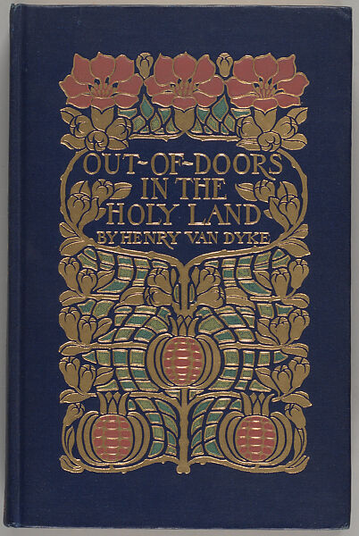 Dark blue ungrained cloth with stain-glass inspired floral design of pomegranates and poinsettia stamped in pink, pale blue, pale green and gold; title and author stamped in gold; top edge gilt; deckled edge. Unsigned, attributed to Margaret Armstrong. Part of a series of bindings by Armstrong for books by Henry Van Dyke published between 1901 and 1926.