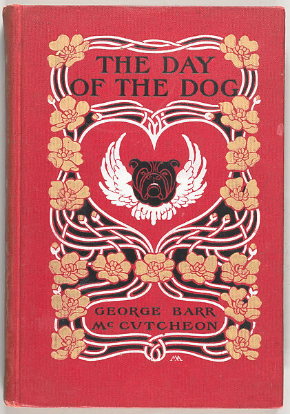 Red cloth stamped in black, tan and white with a symmetrical floral pattern surrounding a winged bulldog's head and title and author in black, title, author, publisher, and floral design stamped in tan on spine, top edge gilt. Signed MA [Margaret Armstrong].