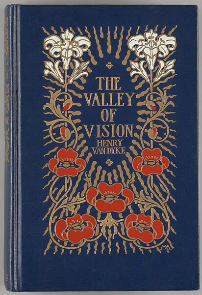 "Signed Margaret Armstrong Art Nouveau binding design in gold, red and white of a central biconvex lens-shaped panel containing the titles, with a stem of Madonna Lilies (Lilium candidum) on either side entwined with poppy flowers (Papaver rhoeas) amid a background of what are likely shafts of light emanating from the lens. Spine with titles with lily and acorn motifs in gold. Includes frontispiece and 7 additional black and white illustrations by various artists. A selection of essays written by Van Dyke about the visions that come to us about the meaning of life while we are in the valley of suffering, endurance and self-sacrifice. Written during and after WWI, the book was published after the conclusion of the war with the experiences of the war in mind. Armstrong's design incorporates poppies, representative of the dreams mentioned in many of the stories as well as death (Flanders Fields also comes to mind), with the Madonna Lily representing purity of soul that comes following suffering. Although Armstrong's design for The Valley of Vision was issued relatively late in her career, it is surprisingly scarce - especially so intact - since the white pigment used for the lilies flaked off fairly easily." -- Austin Abbey Rare Books.