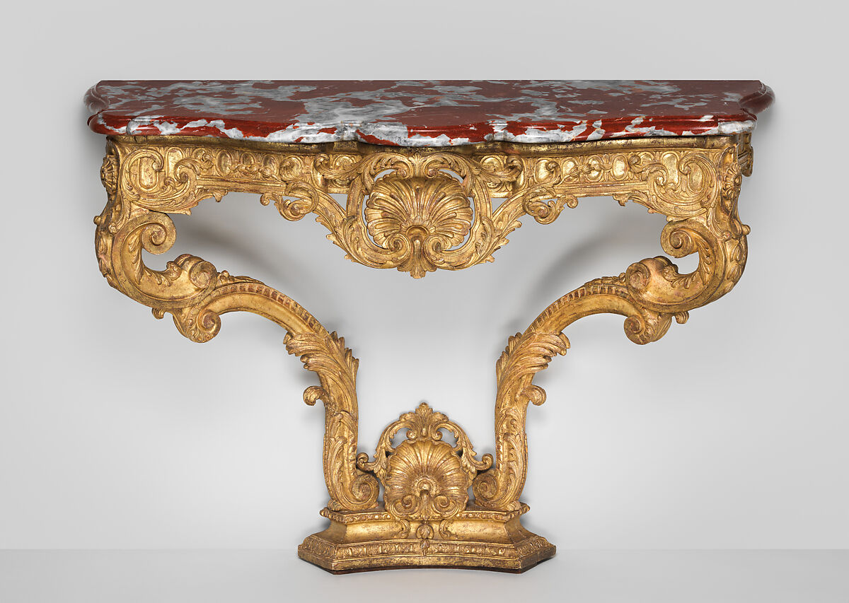 Bridging the transition from the Baroque of Louis XIV to the Rococo of Louis XV, this pair of console tables are executed in the Régence style. Still strictly symmetrical in their decoration, the tables are characterized by their bold carving and the exaggerated curves of their supports. Placed against the pier between two windows and fastened to the wall, console tables were considered part of the interior decoration of a room and were usually custom made. Since such tables were delivered directly to the customer and not sold on the open market, they were generally not stamped and only rarely do we know the name of the artisans involved. While the basic frame was made by a joiner or menuisier en bâtiments, a specialized carver or sculptor would have been responsible for the sculptural decoration.