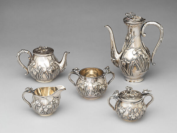 This five-piece sterling silver set, comprising a coffee pot, a tea pot, a covered sugar bowl, a double wall creamer, and a wastewater bowl is an example of hybrid metalworks made in the Meiji period (1868–1912), bringing together Western shapes and functions with Japanese patterns and techniques. Each piece of the set is elaborately chased in a complex design of blossoming irises in water reeds with rippling water. The handles, spouts and lids are also embellished with iris blossoms. The theme of irises growing along a stream was derived from an ancient poem, Yatsuhashi from the Tales of Ise (Ise monogatari), referring to the poet Ariwara no Narihira and his companions on a long journey stopping to rest at Mikawa beside a riverbank abloom with irises. An old rustic bridge of eight wooden planks reminded the weary travelers of a similar spot in Kyoto, for which they expressed their yearning in a series of nostalgic verses. This favored Japanese pattern became popular as an Art Nouveau-style motif in the West. Novelty and freshness were keenly sought design attributes in the wake of Western historic revivals that had reached an apex by the 1876 Centennial Exhibition in Philadelphia. The array of Japanese wares at the exhibition was a catalyst in fueling the fashion in the United States for Japanese design, which played a significant part in the development of the American Aesthetic Movement, which spanned the 1870s to 1880s. Endeavoring to reform the contemporary taste, the Aesthetic Movement sought new sources of inspiration. Leading silver firms, such as the Gorham Manufacturing Company and Tiffany & Co., adopted and adapted Japanese aesthetics and techniques to create visually stunning works, which garnered worldwide recognition.