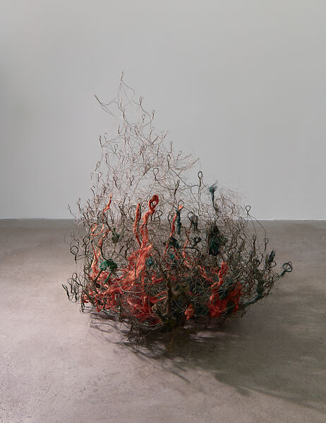 As is common in his practice, this work derives its effects and its principles from the artist’s chosen materials, with media (and process) begetting form. Soaring Sail Mountain unites geometry and organicism, structure and flexibility, order and disorder, inside and outside, buoyancy and solidity. The work seems to be animated by the potential for change, growth, and transformation. Appropriately, it evokes natural phenomena, from fires and bushes to the mountain referenced in the title, a characteristic that sets Saret apart from other postminimalist artists, who generally eschewed the very illusions and associations, both natural and spiritual, that he sought to cultivate. Saret is equally important to the history of sculpture for having re-introduced color into a medium that had, since minimalism at least, generally avoided it; Soaring Sail Mountain evidences this shift as well, possessed as it is by a distinctive polychromatism, thanks to its use of both slate gray steel wire and bright orange copper wire.