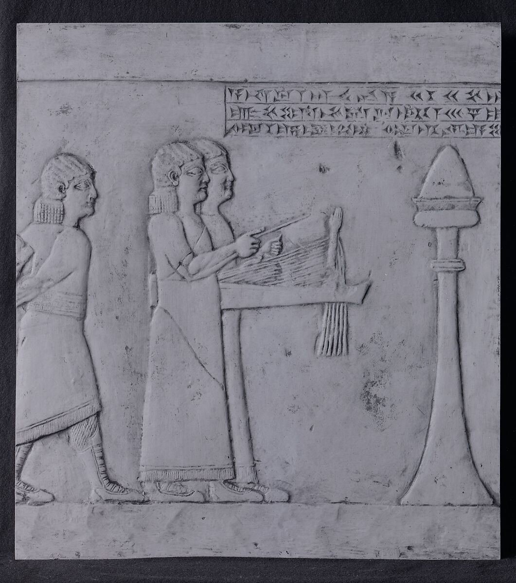 Three reproductions of Assyrian reliefs from the palaces at Nimrud and Nineveh were selected from the museum’s collection of casts to be displayed in the Musical Instruments galleries. This one is a detail from a wall panel, made after an original in the British Museum, showing King Ashurbanipal (r. ca. 668-627 B.C.) celebrating a lion hunt (BM 124887). It corresponds to the left of the libation scene with a musician playing a seven-stringed horizontal harp and beside him a second figure, possibly another harpist.