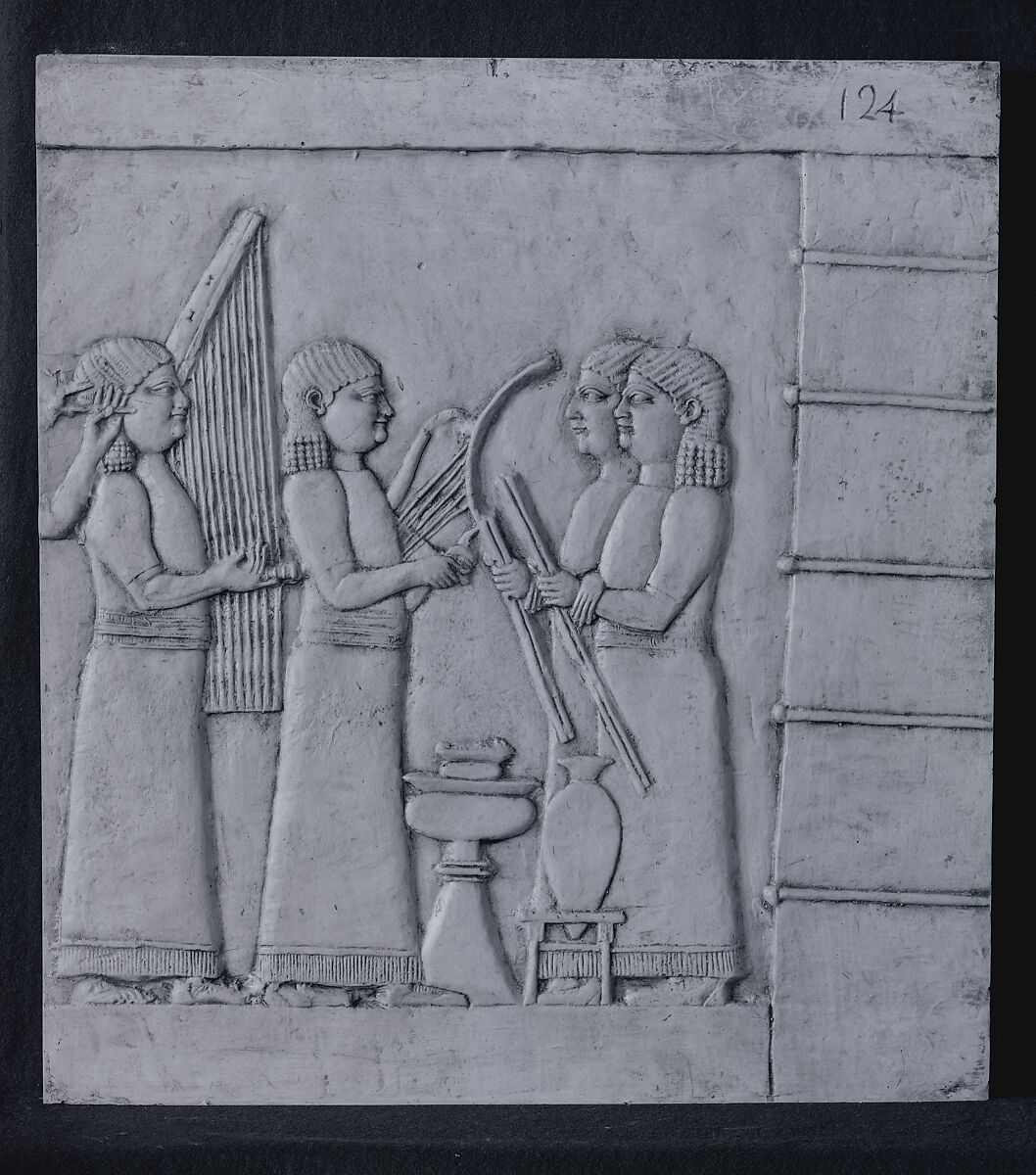 Three reproductions of Assyrian reliefs from the palaces at Nimrud and Nineveh were selected from the museum’s collection of casts to be displayed in the Musical Instruments galleries. This one is a detail from a garden scene showing musicians playing on a lyre, vertical harp, and double pipes. The original forms the right end of the relief known as the Banquet of Ashurbanipal (r. ca. 668-627 B.C.) (BM 124922).
