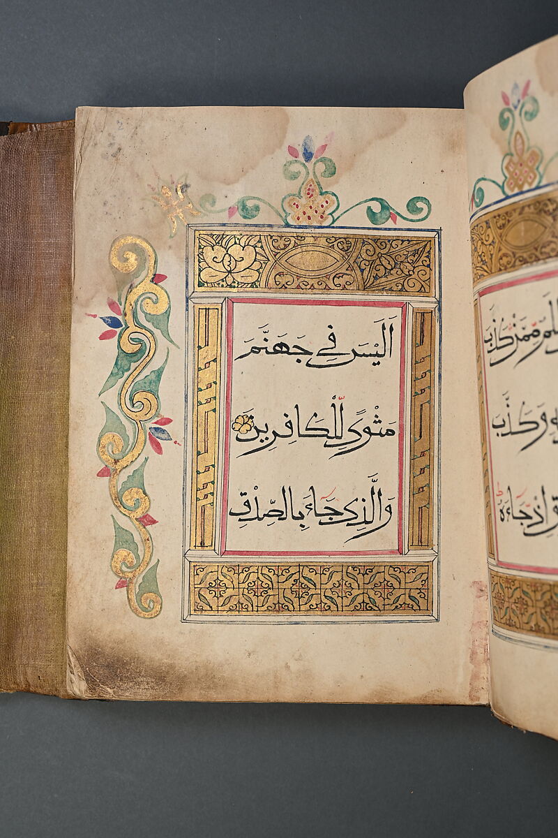 This juz' is written in Sini script, a variation of muhaqqaq (one of the six canonical proportional scripts). Several of its folios are illuminated with decorative patterns characteristic of Sini Qur'ans. These are typically executed in gold and outlined in black, green, and red ink. The patterns and motifs found in these Qur'ans include overlapping circles, eye-shaped and lobed cartouches, four-petalled floral diesigns and star-shaped geometric forms, and plaited framing devices. This juz' features ornate swirling vegetal designs in the outside borders and is bound in richly decorated stamped brown leather binding featuring Sini calligrams in teardrop-shaped medallions, sinified cartouches, and medallions.