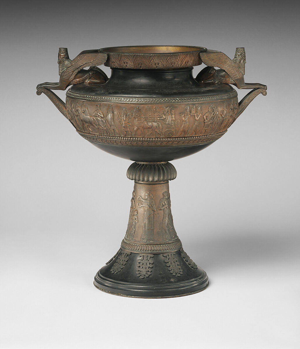 Examples of this Matifat urn design were included as representatives of French metalworking at the 1851 Great Exhibition in London. The decoration combines and reworks scenes of hunting and war drawn from the recently discovered Assyrian palace reliefs. One side shows a procession, at the center of which the king, recognizable by his tall cylindrical crown, stands in a chariot, shaded by a parasol, raising his hand in a pious gesture frequently seen in the reliefs. Behind him, figures carry objects including the statue of a deity, the model or symbol of a city, and elaborate furniture; in the ancient reliefs these were depicted as the booty captured in foreign military campaigns. The other side of the urn shows the progress of a lion hunt, with archers in a chariot (in a real Assyrian hunting scene the main figure in the chariot would be the king) and horses running over a lion that has been shot with arrows. The scene also includes figures carrying the bodies of antelope that have been killed, and mastiffs, large dogs used in hunting and herding, all of which are pictured in the ancient reliefs. The stems of the urns carry a different kind of imagery, musicians and dancers whose forms and dress blend Assyrian and classical sources. The handles are in the form of winged lion-sphinxes, whose long beards and divine, bull-horned headdresses are based on the winged bull and lion guardian figures found at important entrances in the Assyrian palaces. Finally, where the handles meet the body and around the base of the urn, are quite faithful reproductions of the so-called ‘sacred tree,’ a fantastic plant seen in many Assyrian reliefs (for example 32.143.3). The tree’s exact ancient significance is uncertain, but it seems to have represented the fertility, abundance, and wellbeing of the Assyrian state itself.