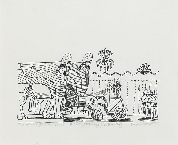This is the design drawing for an illustration published in Joan Comay’s The World's Greatest Story: The Epic of the Jewish People in Biblical Times (1978, Holt, Rinehart and Winston), a popular history enhanced by Bawden’s lively artwork. The imagery incorporates examples of ancient art and architecture, in this case, winged lions of a type that stood at important gateways in Assyrian palaces (see 32.143.2), and reliefs that showed the king participating in highly ritualized royal lion hunts. The image introduces "The Near East Setting," a section that discusses the Assyrian Empire as a major regional power as well as its role in biblical history.