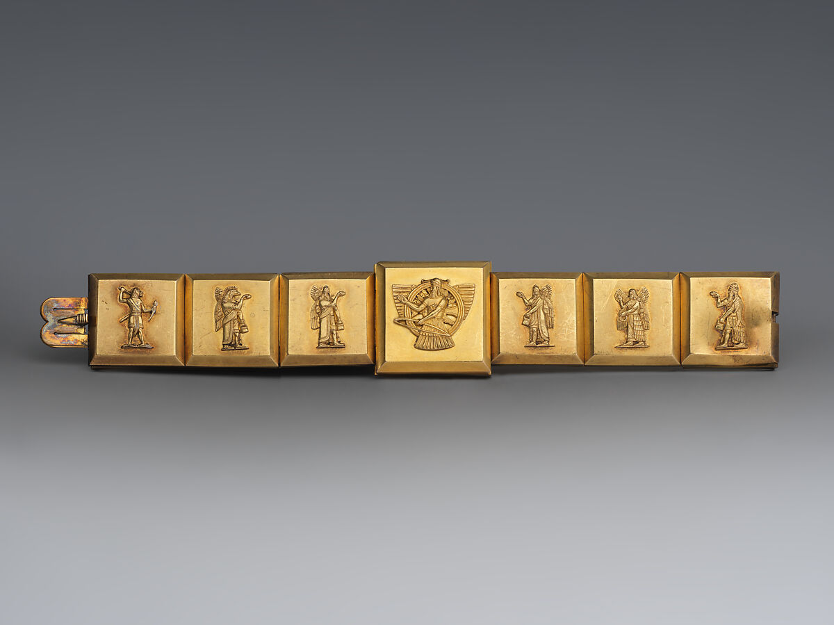 This Assyrian revival bracelet, composed of seven hinged plates, features a variety of the supernatural figures seen on the monumental stone reliefs found in the Assyrian palaces. The central panel shows a god in a winged sun-disc, usually interpreted as the state god Ashur or the sun god Shamash.