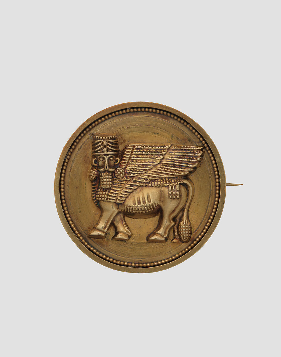 This brooch is part of a demi-parure with earrings (2023.680a, b), all three pieces featuring one of the winged bull gateway guardian figures that would become the modern icons of the ancient Assyrian palaces. The back of the brooch features a glass compartment for storing a picture or other keepsake.