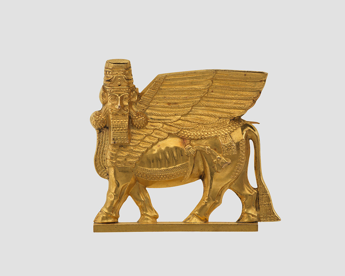 This brooch may actually have been commissioned by Austen Henry Layard, whose excavations at Nimrud and Nineveh and shipment of Assyrian sculptures from those sites to England made him a Victorian celebrity. It seems most likely that the brooch was made by a jeweller in Bournemouth, England, to a design by Layard. The brooch is in the form of a human-headed winged bull. These and similar winged lion figures, based on the colossal guardian sculptures found flanking important gateways in the palaces, became the modern icons of the Assyrian excavations and were the motif most commonly used in Assyrian revival jewelry and decorative arts.