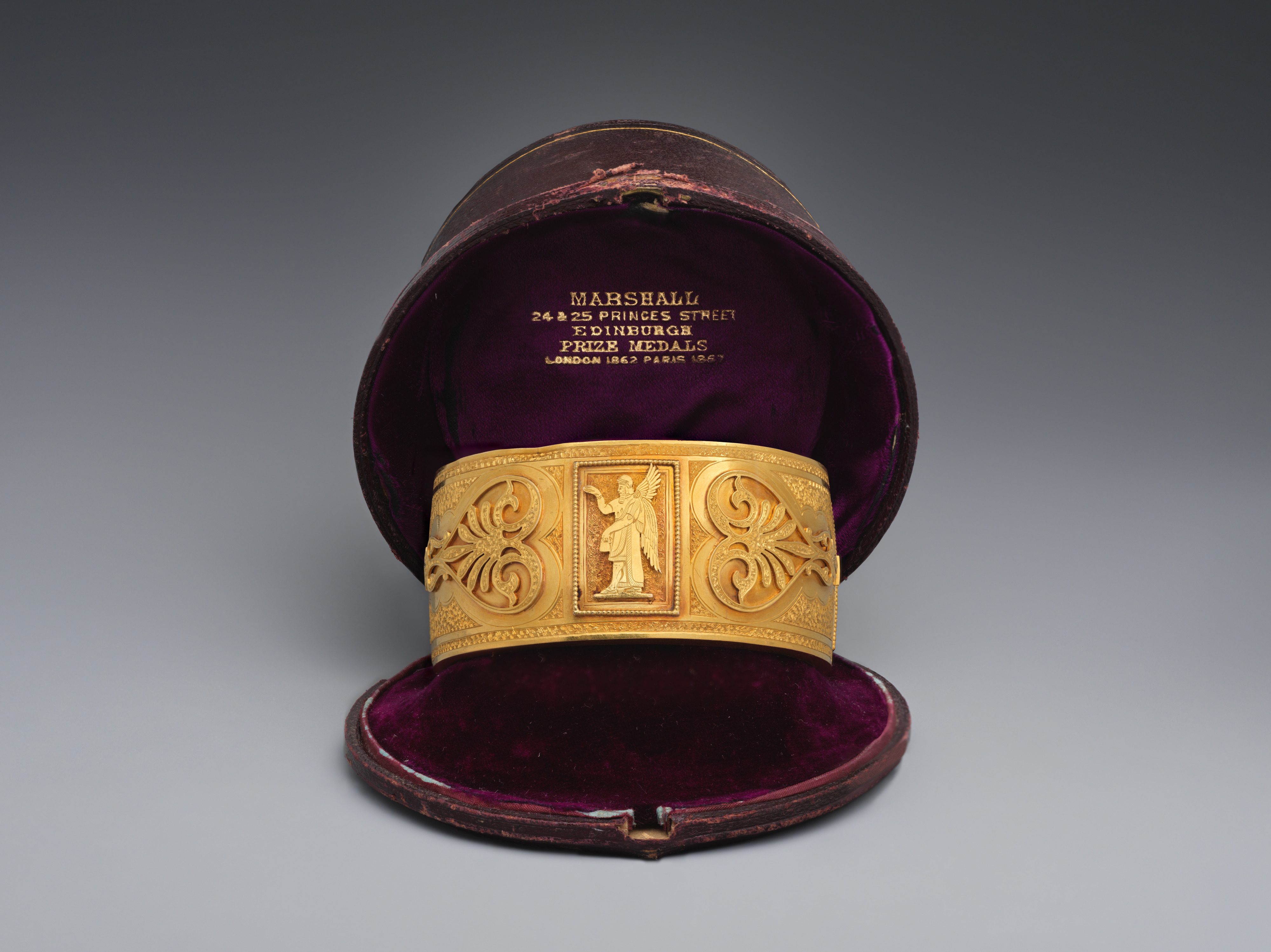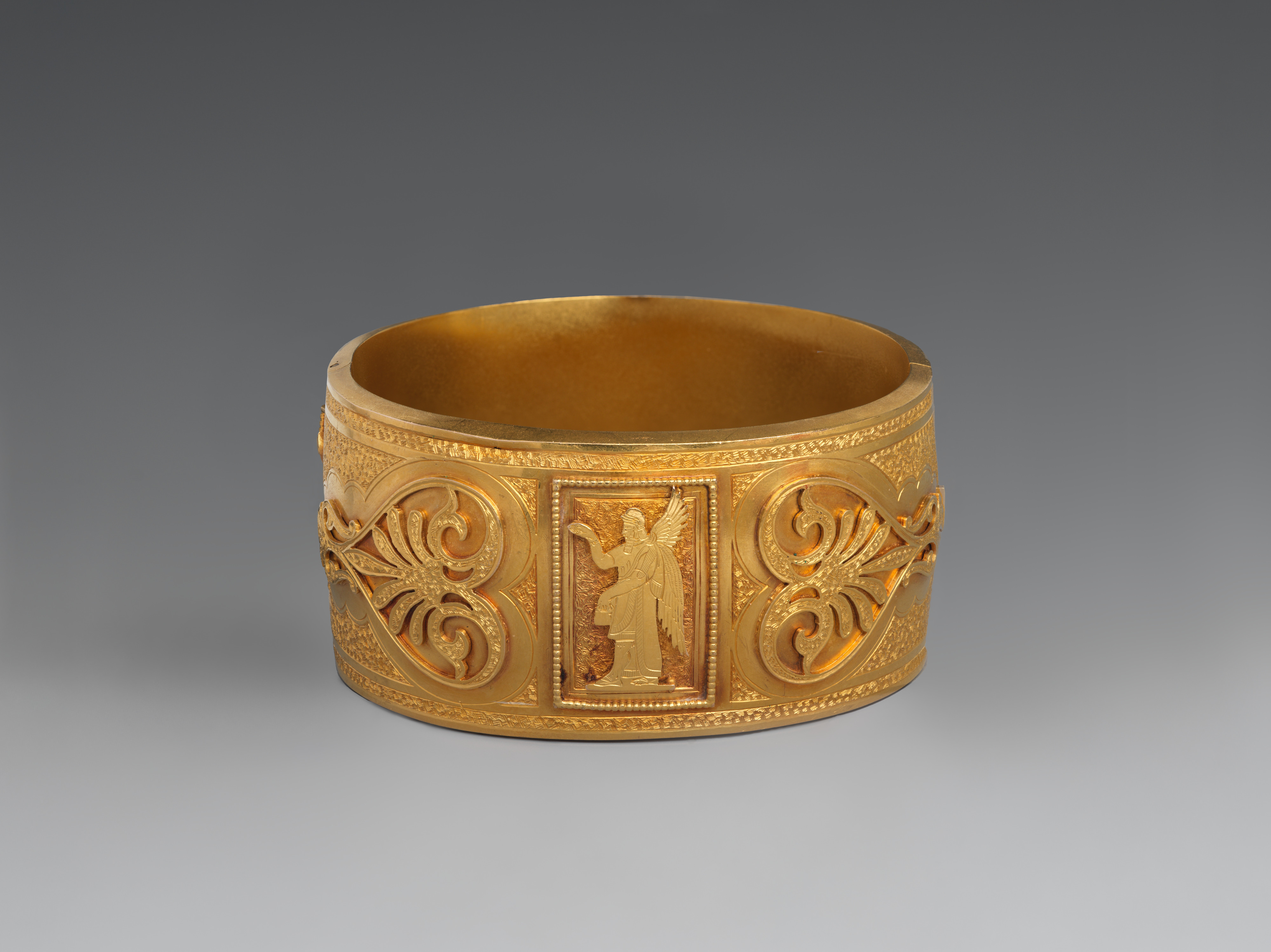 This hinged bracelet features a design based on reliefs from the Northwest Palace of Ashurnasirpal II (r. ca. 883–859 BCE) at Nimrud, ancient Kalhu. The central scene on one side of the bracelet is modeled on a relief now in the British Museum showing a royal lion hunt, with the addition of a winged disc containing an archer god, drawn from military scenes in the same palace. At either side of this main scene and on the other side of the bracelet are eagle- and human-headed protective figures, sometimes identified with apkallu, wise sages from before the great Flood of Mesopotamian mythology, that appeared on many of the reliefs, and stylized plant motifs that refer to ancient Greek and Etruscan as much as to Assyrian art.
