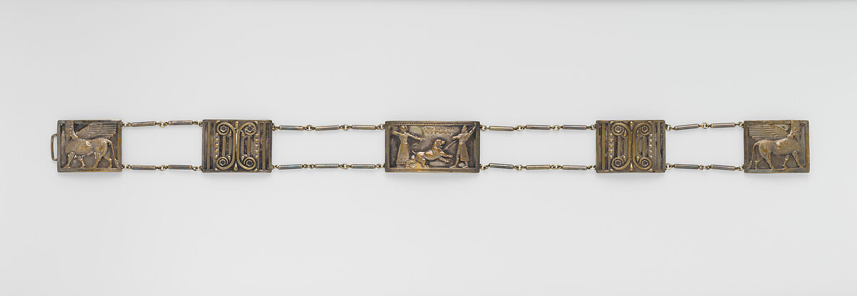 The links of the belt show a variety of Assyrian imagery, including at the center a royal lion-hunt scene with a pseudo-cuneiform inscription, as well as human-headed winged bull gateway guardian figures, known as lamassu, based on those from the palace of Sargon II (r. 722–705 BCE) at Khorsabad. These figures, and similar winged lions, were the motifs most commonly used in Assyrian revival jewelry and decorative arts.