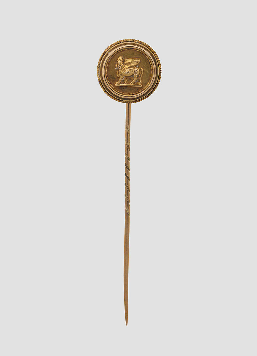 This pin forms part of a set with a pair of cufflinks (2023.700a, b) and three dress studs (2023.701, .702a, b). All are decorated with human-headed winged bulls, based on the colossal guardian sculptures found flanking important gateways in the palaces that became the modern icons of the Assyrian excavations and were the motif most commonly used in Assyrian revival jewelry and decorative arts. Although the winged bull designs on all match closely, the pieces do bear different marks. One stud and both cufflinks bear the maker’s mark "J & A", the other two studs the maker’s mark "D & M"; the stick pin does not bear a maker’s mark.