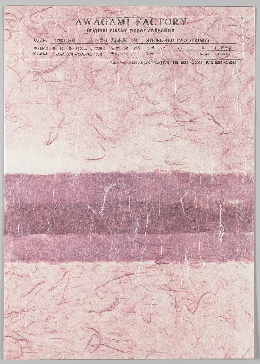 Issued in a kōzo paper folded enclosure, this selection of thirty-six specimens was presented by distributor Hiromi Paper International, and includes samples of cedar bark, straw, hemp, synthetic, composite, and traditional washi from Fuji Paper Mills Cooperative in Tokushima, Japan. Washi (和紙, literally "japanese paper") refers to paper manufactured using traditional vat methods, specifically that which is made from mitsumata, gampi, or kozo fibers with or without a neri additive. Washi is manufactured in two methods, tame-zuki and nagashi-zuki, similar to that of traditional Western linen rag paper.